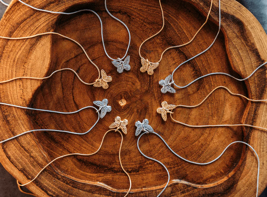 We sell a signature custom butterfly necklace, available in both stainless steel and plated 18ct gold. Durable, timeless and a symbol of our movement to spread kindness and love.